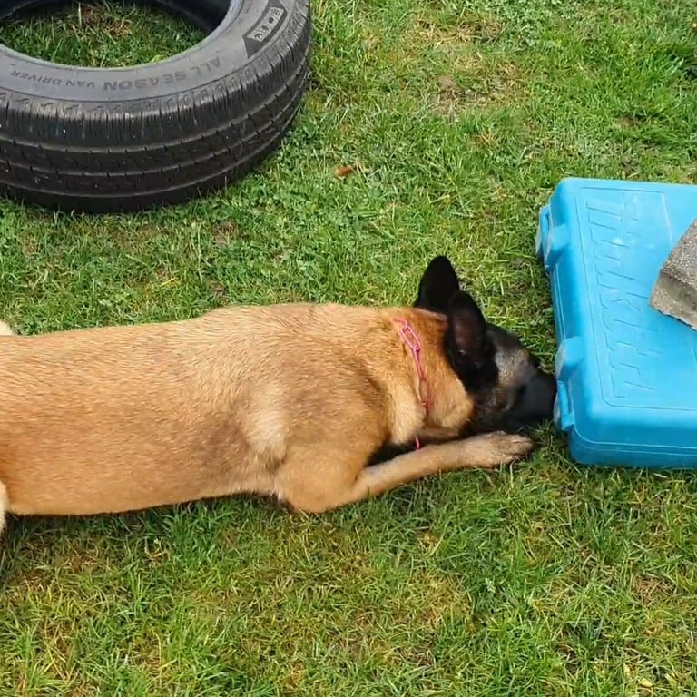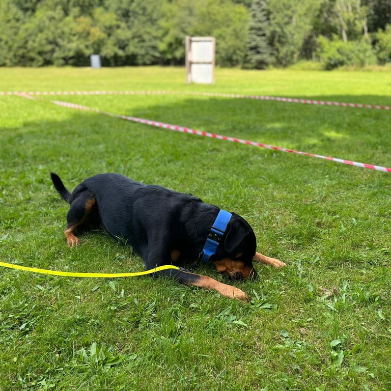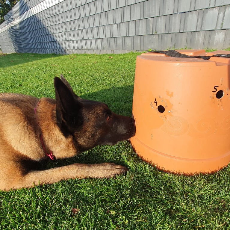 Er soll diesen Gegenstand lokalisieren und durch passive Platzablage verweisen. Der Hund sollte mit seiner Nase hierbei möglichst nah am Suchobjekt sein.